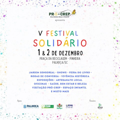 Nestes dias 01 e 02 de dezembro a Associação Pro-Crep vai promover a quinta edição do Festival Solidário na praça da reciclagem, praia da Pinheira, em Palhoça. Serão dois dias de muitas atividades nas mais variadas linguagens, tudo girando em torno do propósito maior da Entidade, que é a preservação do meio ambiente através de comportamentos sustentáveis.